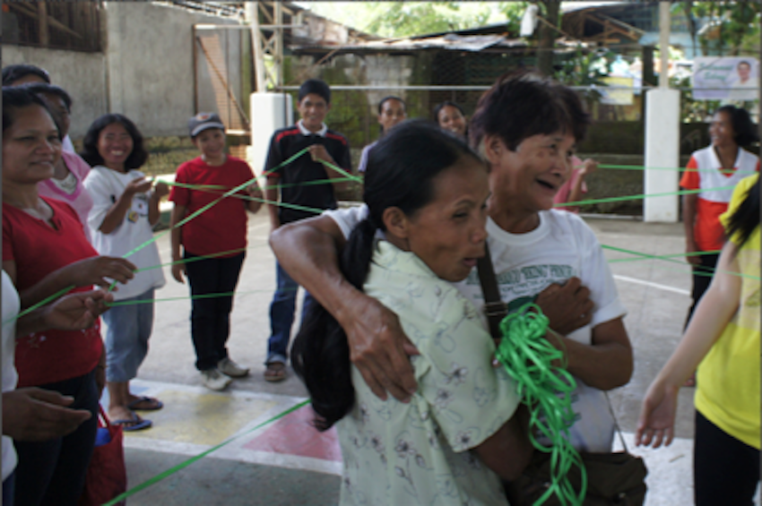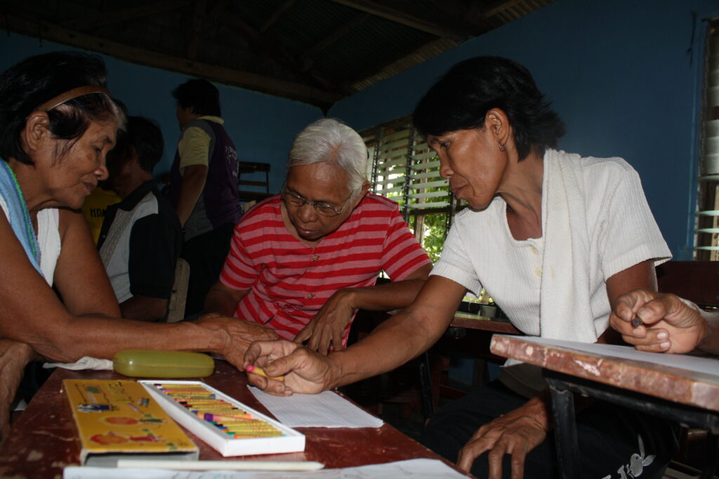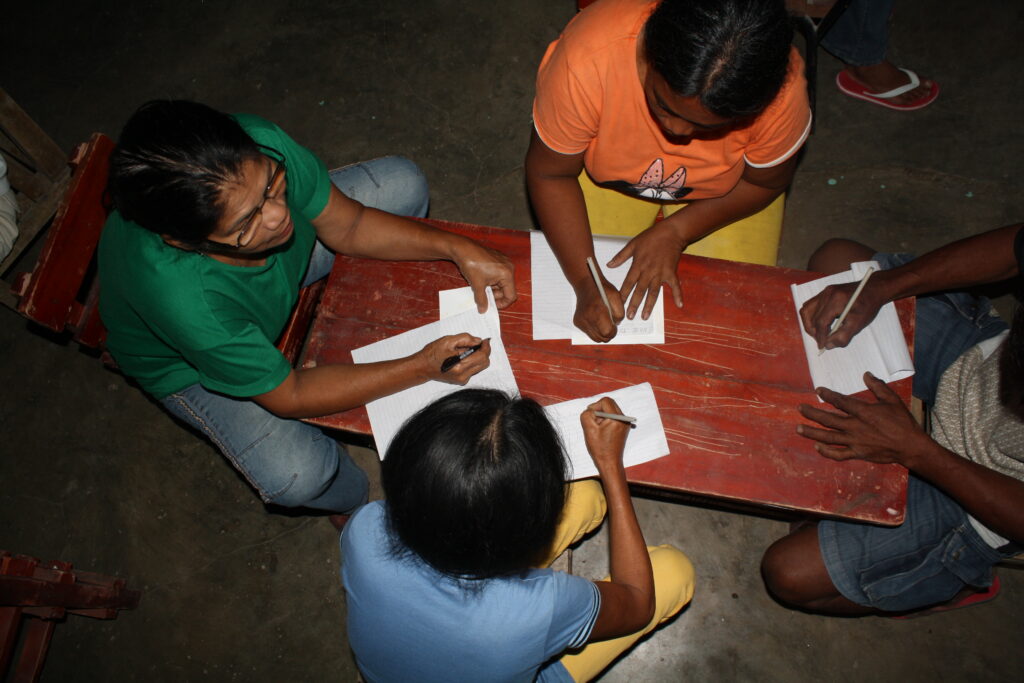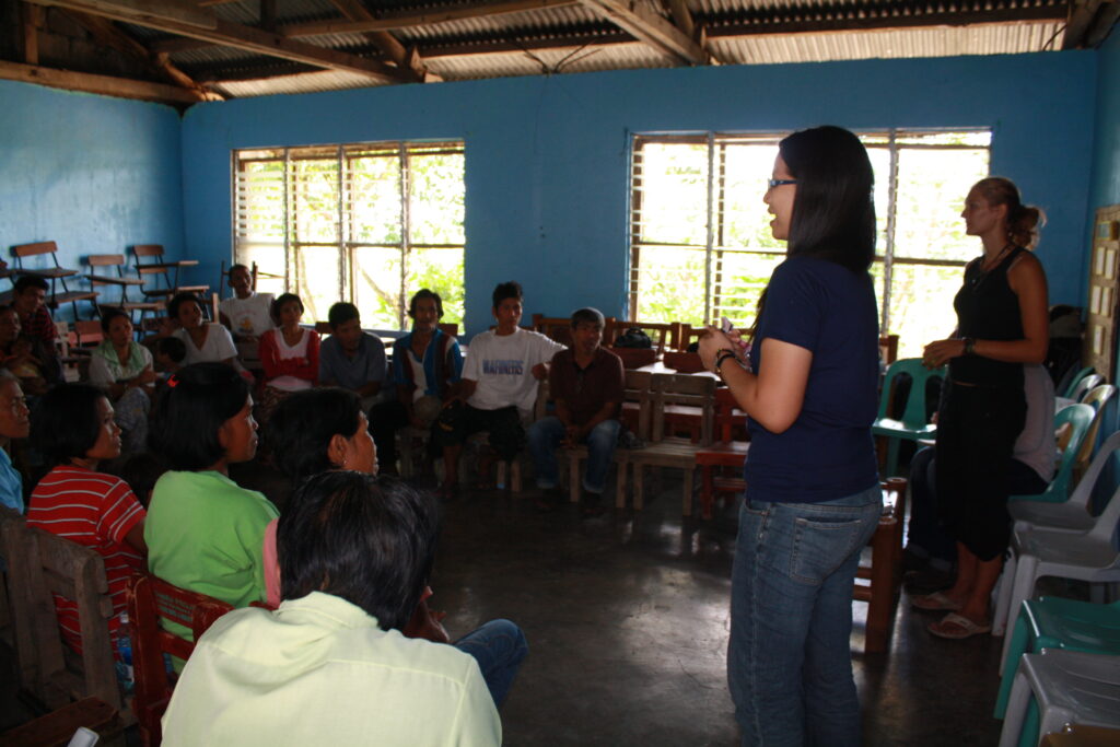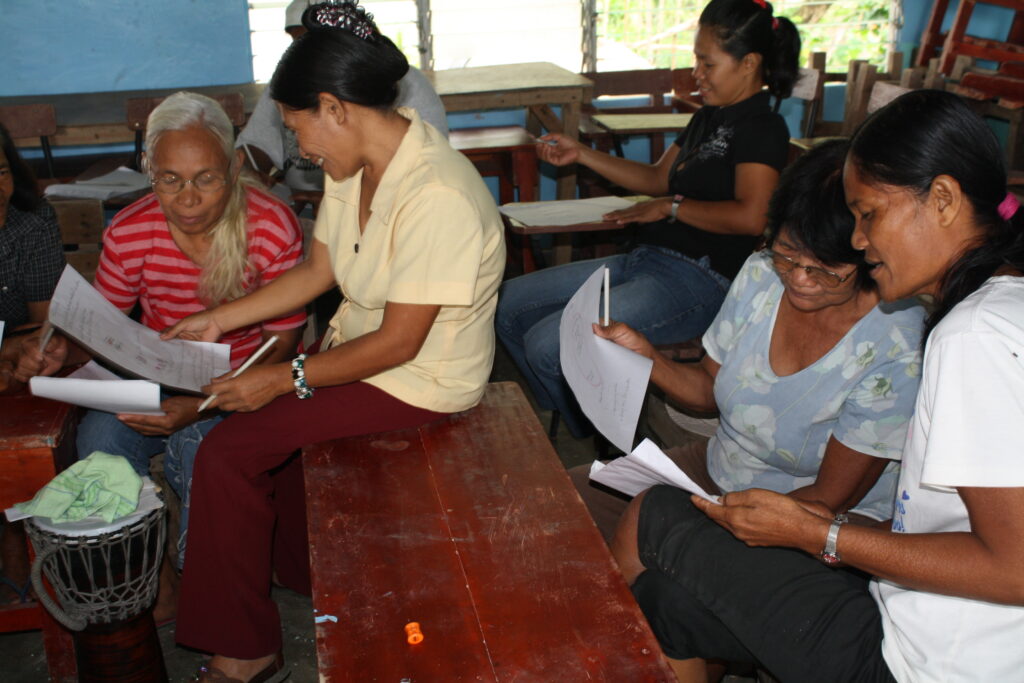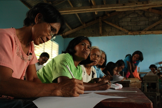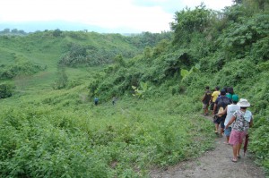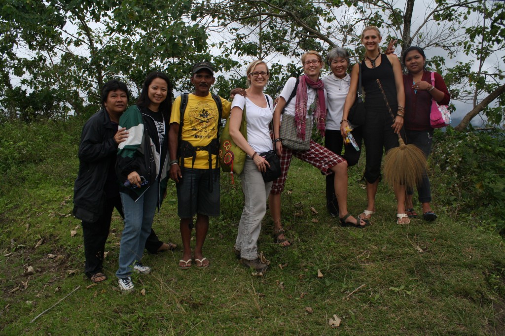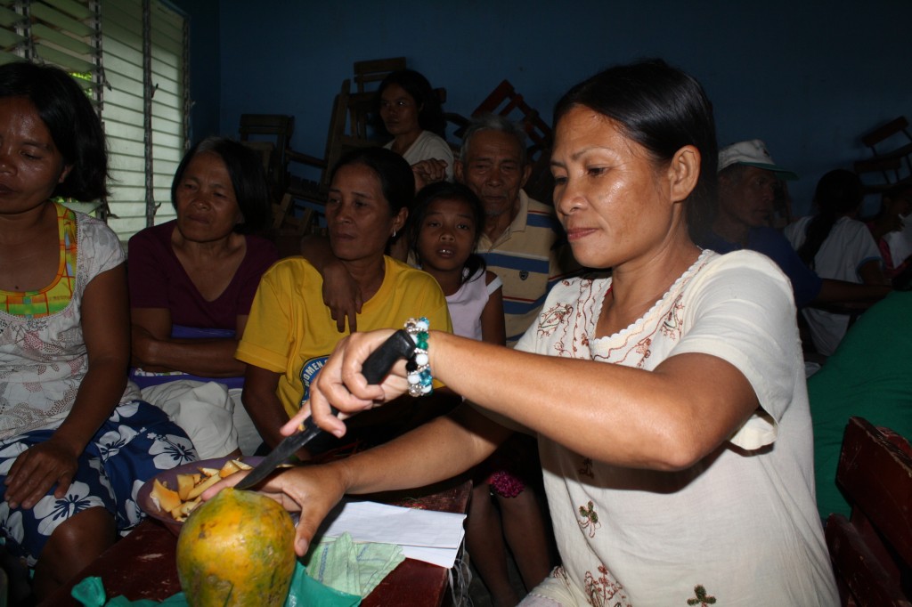 Then we stopped and loaded in some people at the tribe chief’s house. Then we bounced up a rickety dirt road as far as the jeepney could take us. And then we got out and hiked the rest. About 1 km. On a path through amazing landscapes. Up a hill, across a ridge, down a hill, up again and then we reached the school of the community. Everyone was there, kids were staring at us, and we were ushered past classrooms to the largest hall of the little complex. This was where the workshop was going to be. The attendees who had come in the morning had been sent home for lunch in the mean time, so we settled in, arranged the chairs in a big circle, and prepared some lunch with the veggies we had brought. All the time we were being watched, and helped.