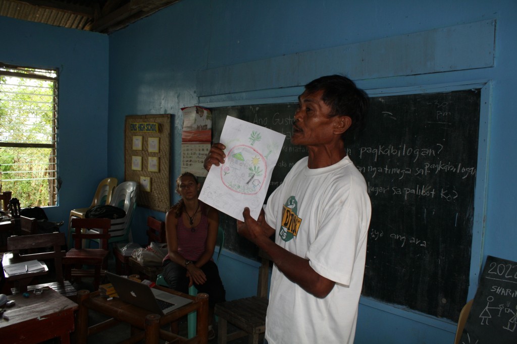 Hmmm. Yes, I guess, if you don’t have tv, you walk for two hours through nature to get to school, then I guess yes, you may never have seen anyone like me, pink skinned and blonde. We continued, they asked questions in their language, Jean translated. They wanted to know where I come from (we looked at the globe, all there was, was the usual three letters LUX covering a dot – my country is too small to put the name in), what its like over there and if I was married (everybody wants to know that). They sniggered a lot, other kids crowded at the windows to watch. I felt like Lady Di. This was fourth grade. They learn English from a very young age, it is a national language in the Philippines (which makes it rather easy to travel here). Yet these kids needed translation. I asked them if they understood me, some nodded, so I encouraged them to keep it up, they were doing really good.