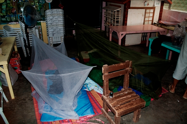 Princess suites in the day care center Dinner was good, after that we moved into our quarters. The day care centre. The lady who brought us the Jackfruit the next morning had actually offered to sleep there with us, which was an offer of generosity that threw us all aback. We said we’d be fine, she should go home to her place and family. The teachers spared us some mattresses from their camp beds, so once the mozzie-nets were up, we had a pretty nice little suite.